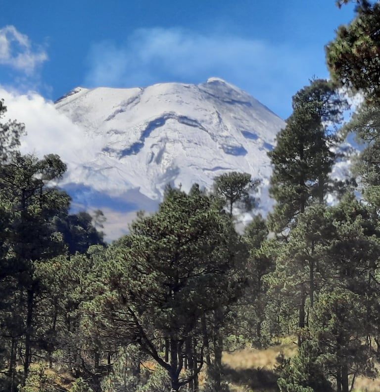 El amanecer trae consigo temperaturas bajísimas y el volcán lo deja claro. En el camino, aparece entre las nubes Don Goyo, el Popocatépetl, cubierto de nieve. Aunque su acceso está cerrado por ser un volcán activo, su presencia impone respeto.