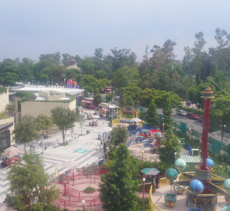 Desde que entras al parque, la energía se siente en el ambiente. La plaza central destaca por sus fuentes, restaurantes y áreas de descanso, mientras que al fondo se alza el gran ícono del parque: la rueda de la fortuna, visible desde distintos puntos del bosque.